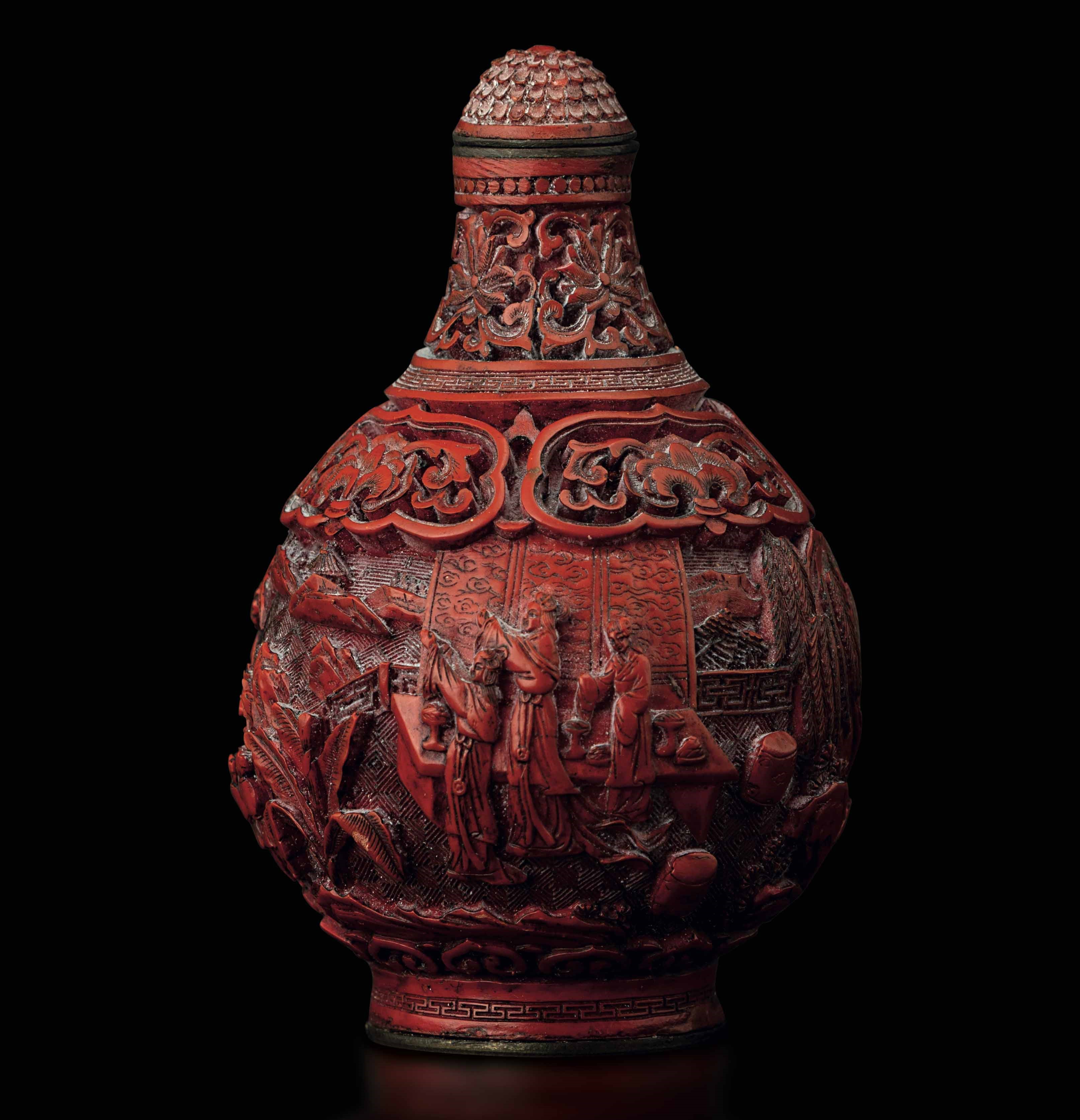 Snuff bottle finemente scolpita in lacca raffigurante paesaggio con dama e fanciulli, [..]