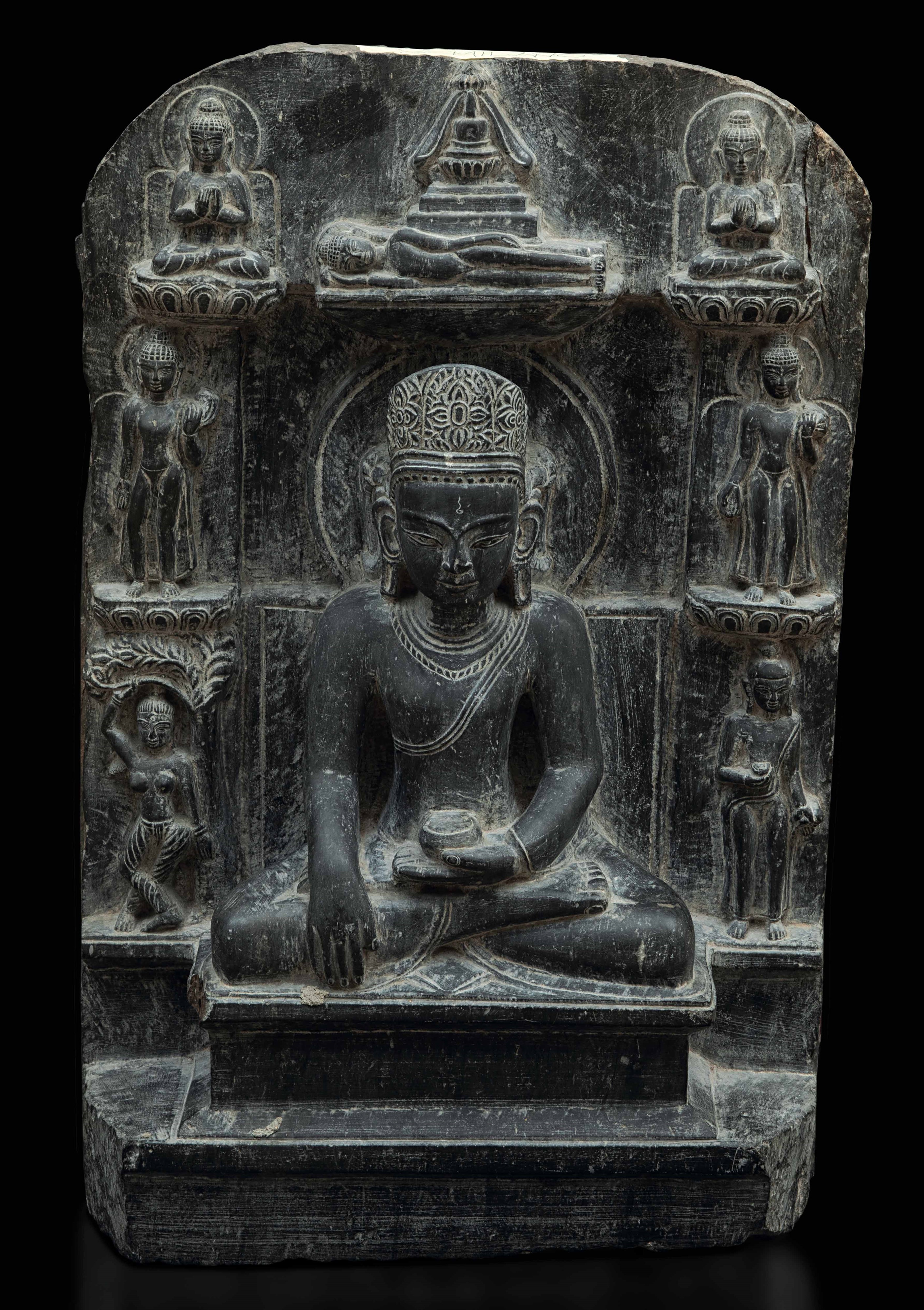 Stele scolpita in pietra con figura centrale di Buddha Sakyamuni e altre divinità, [..]