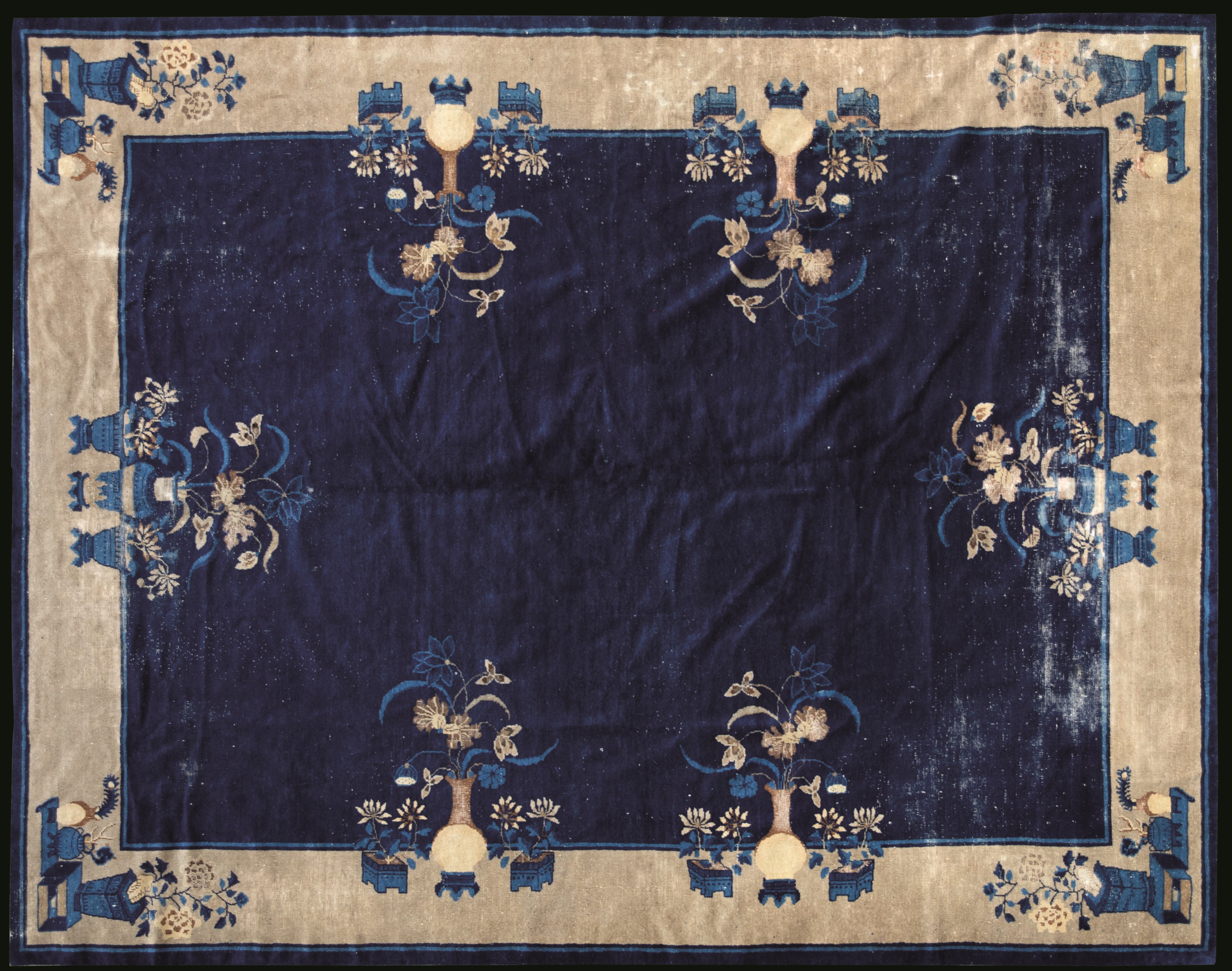 Tappeto raffigurante soggetti naturalistici su sfondo blu, Cina, Dinastia Qing, [..]