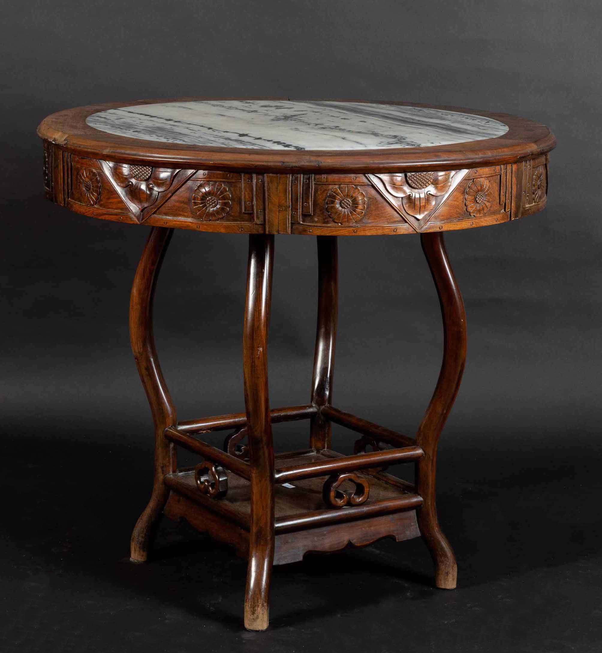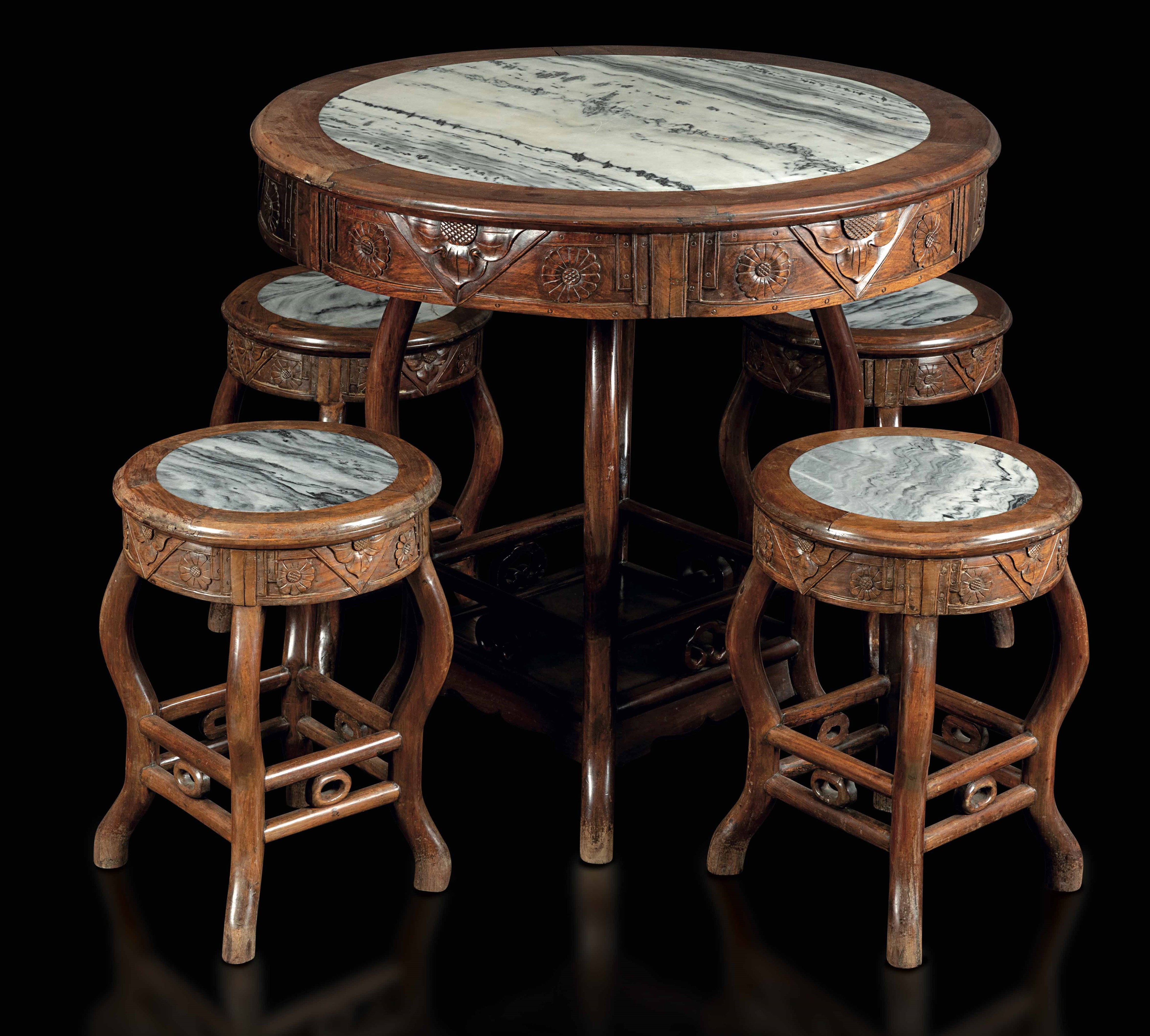 Tavolo rotondo e quattro sgabelli in legno con piano e sedute in marmo, Cina, Dinastia [..]