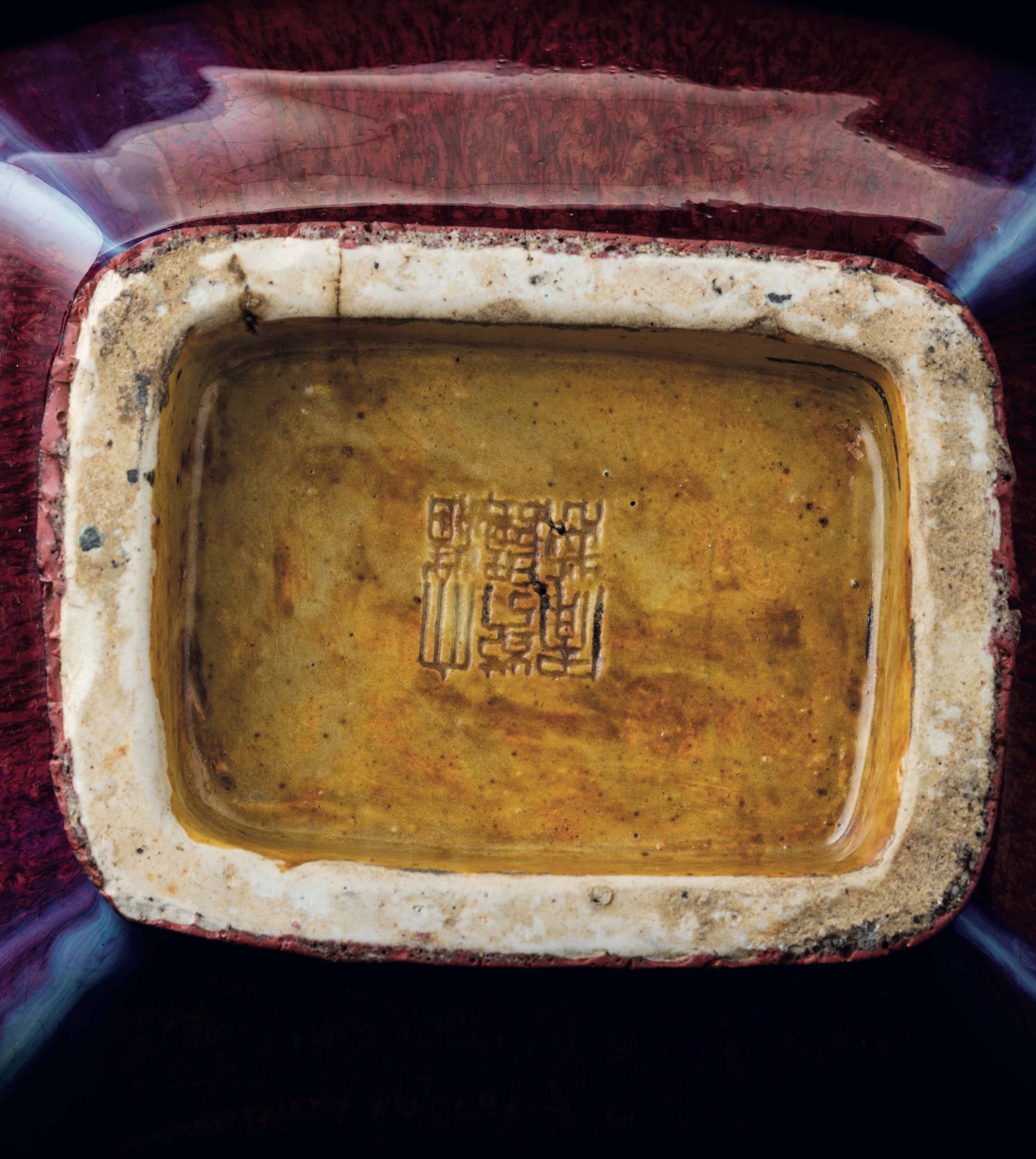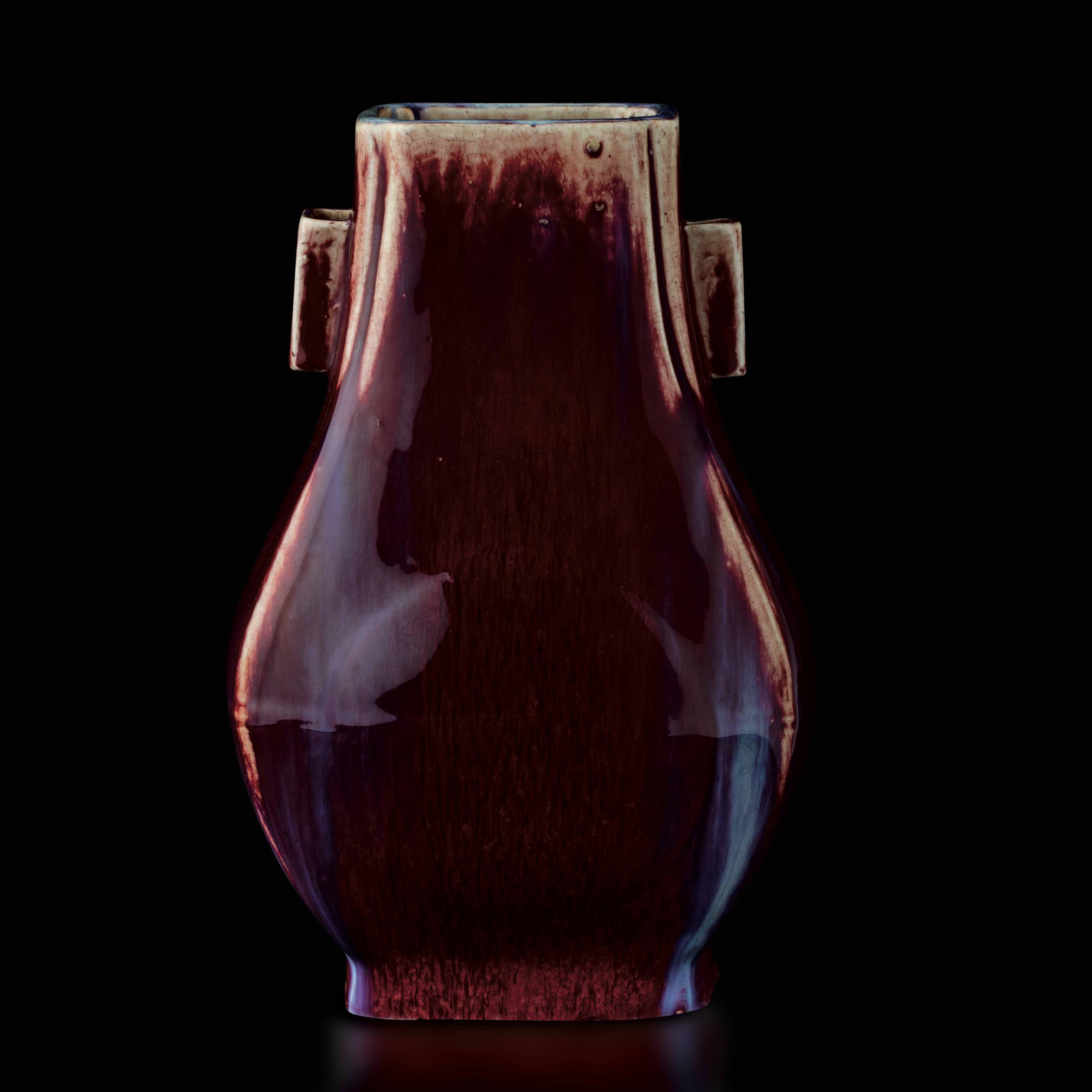 Vaso Fang Hu in porcellana flambč sui toni del sangue di bue, del viola e dell'azzurro, [..]