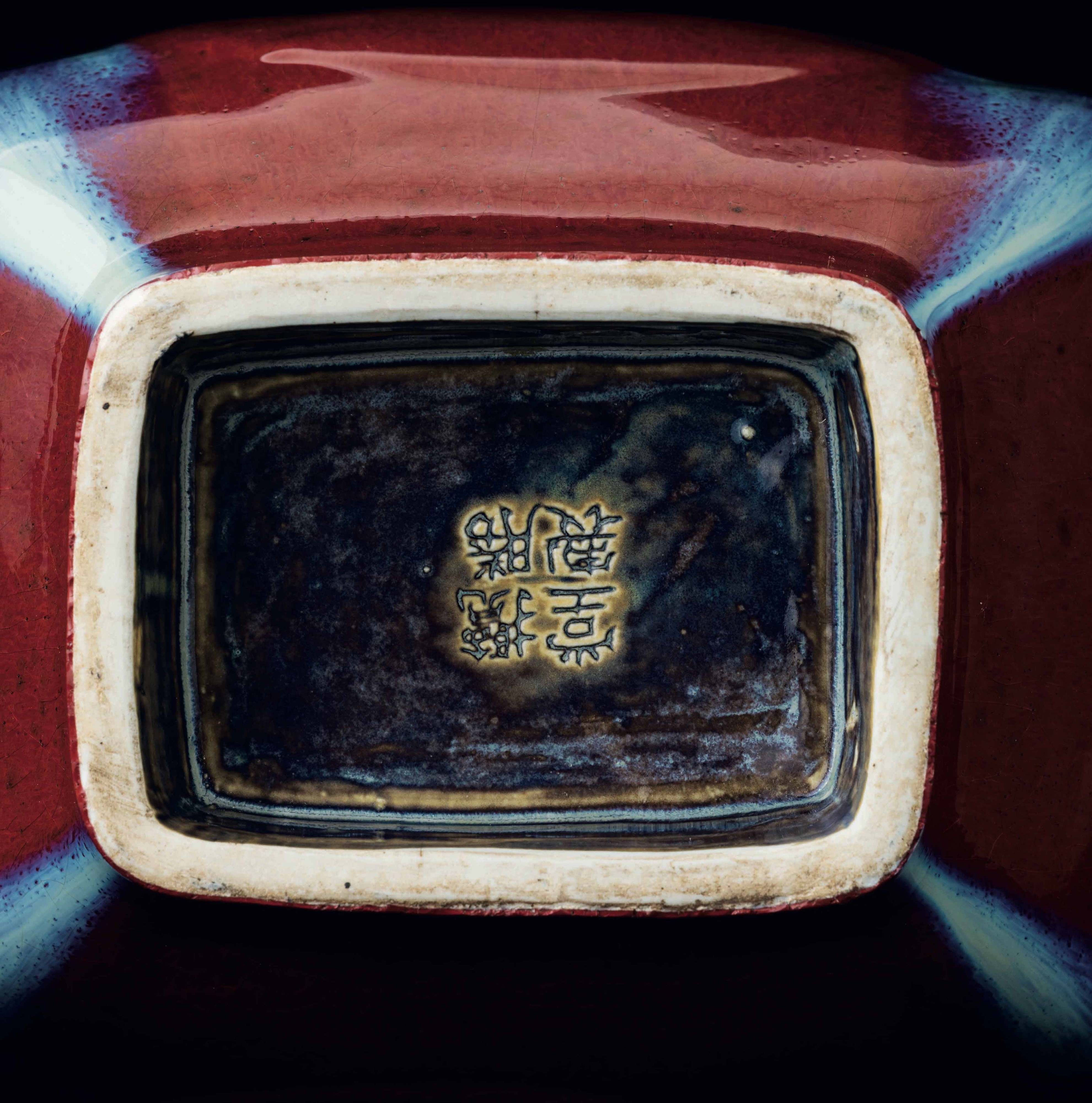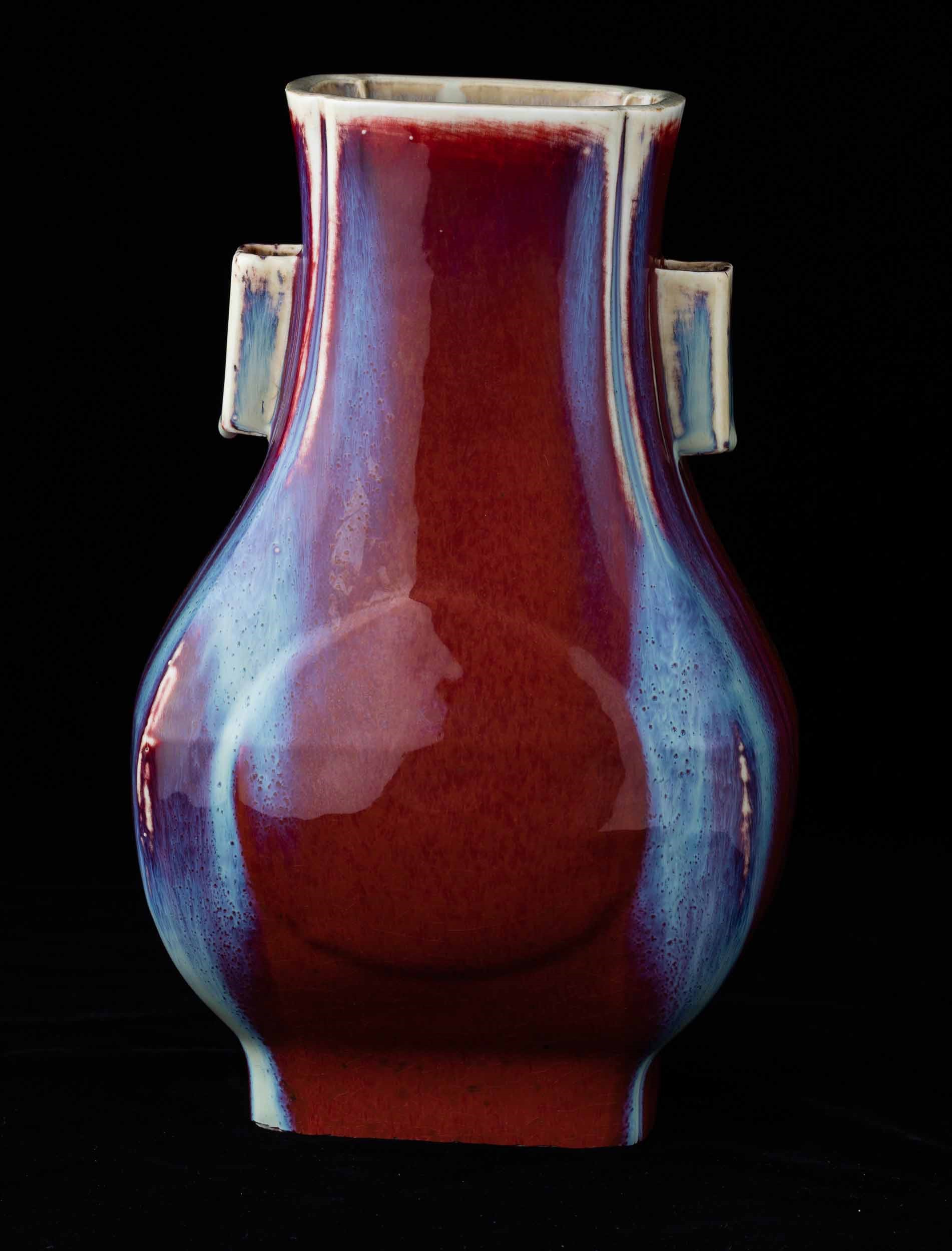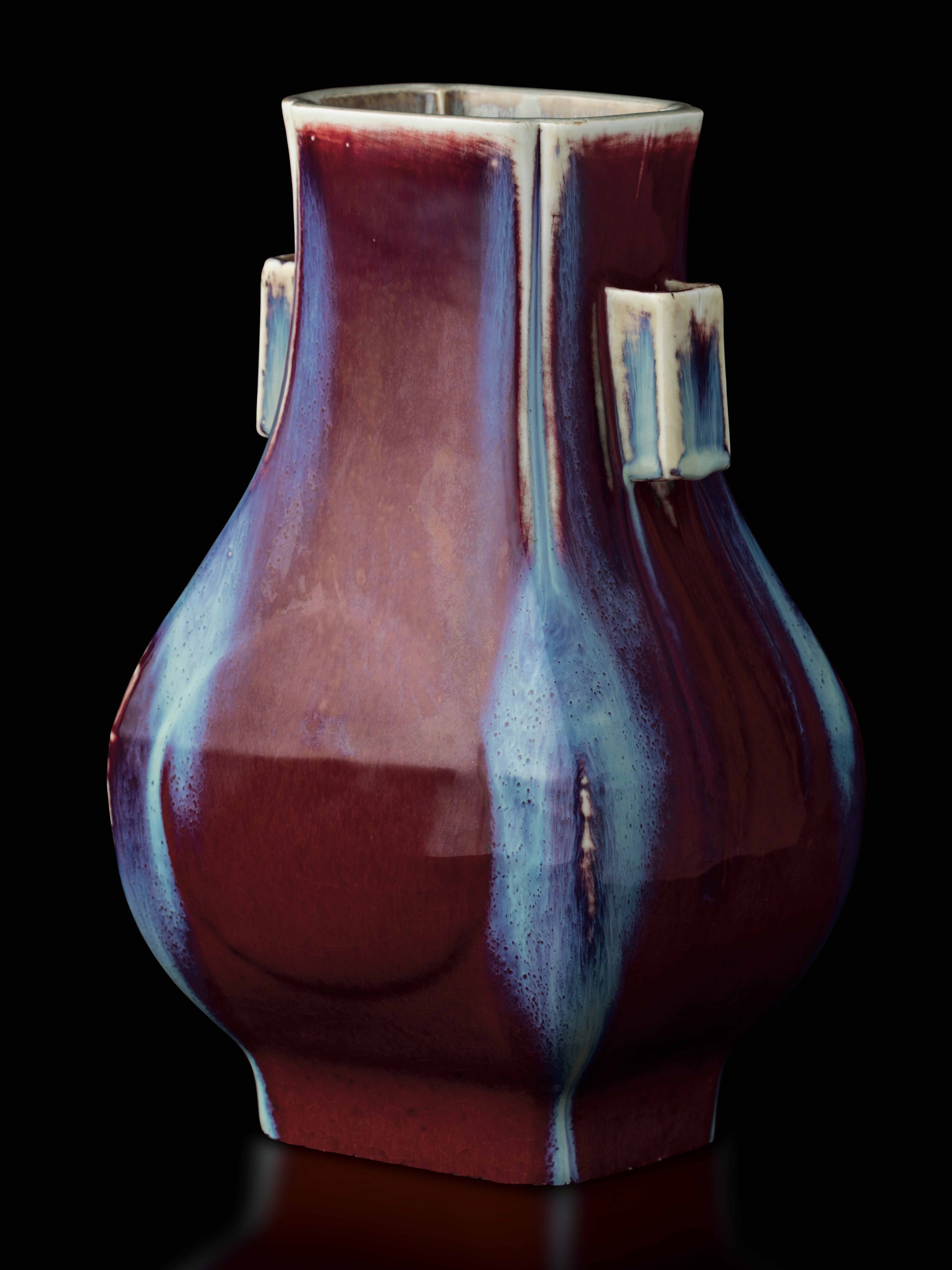 Vaso Fang Hu in porcellana flambč sui toni del sangue di bue, del viola e dell'azzurro, [..]