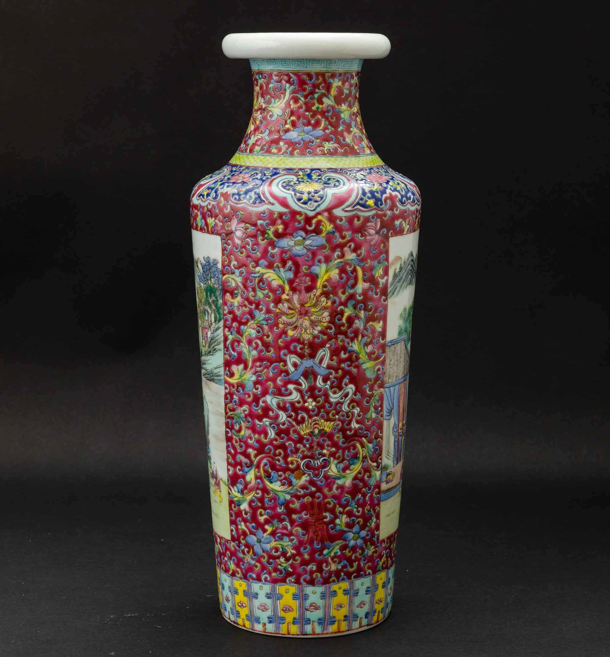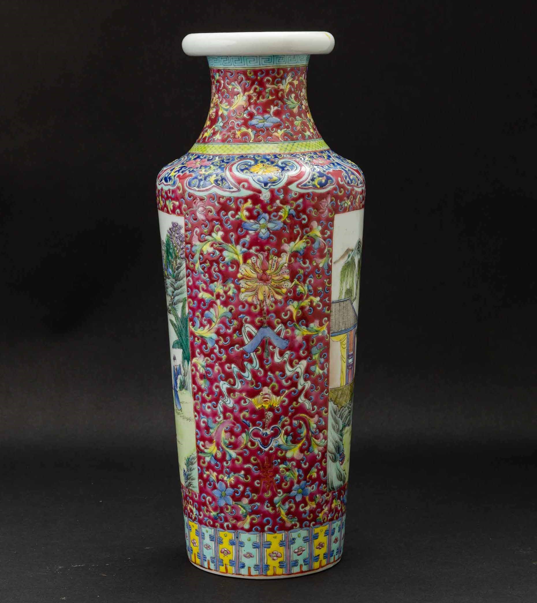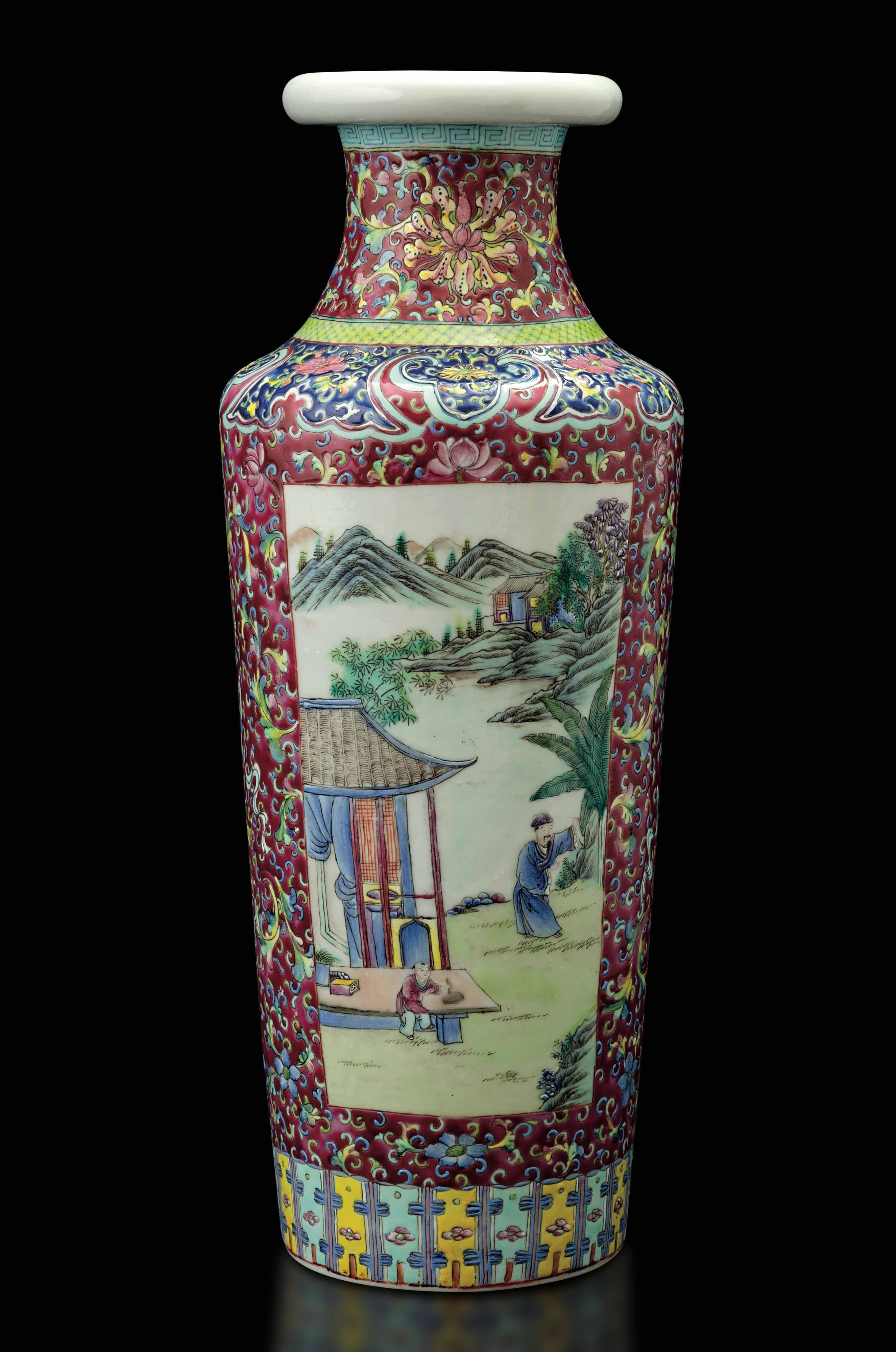 Vaso in porcellana a smalti policromi con decori floreali e scene di vita comune [..]