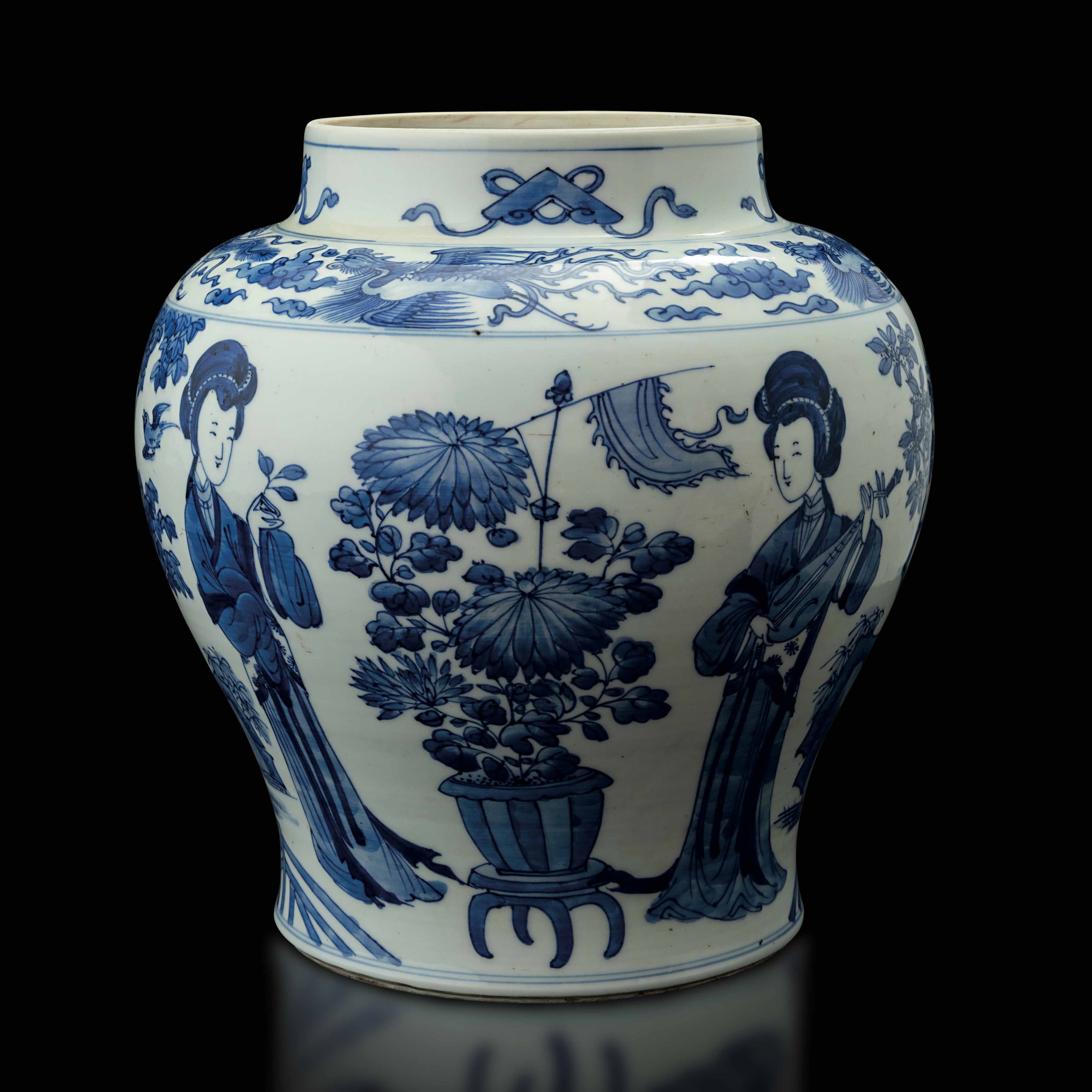 Vaso in porcellana bianca e blu con figure di fanciulle e simboli taoisti, Cina, [..]