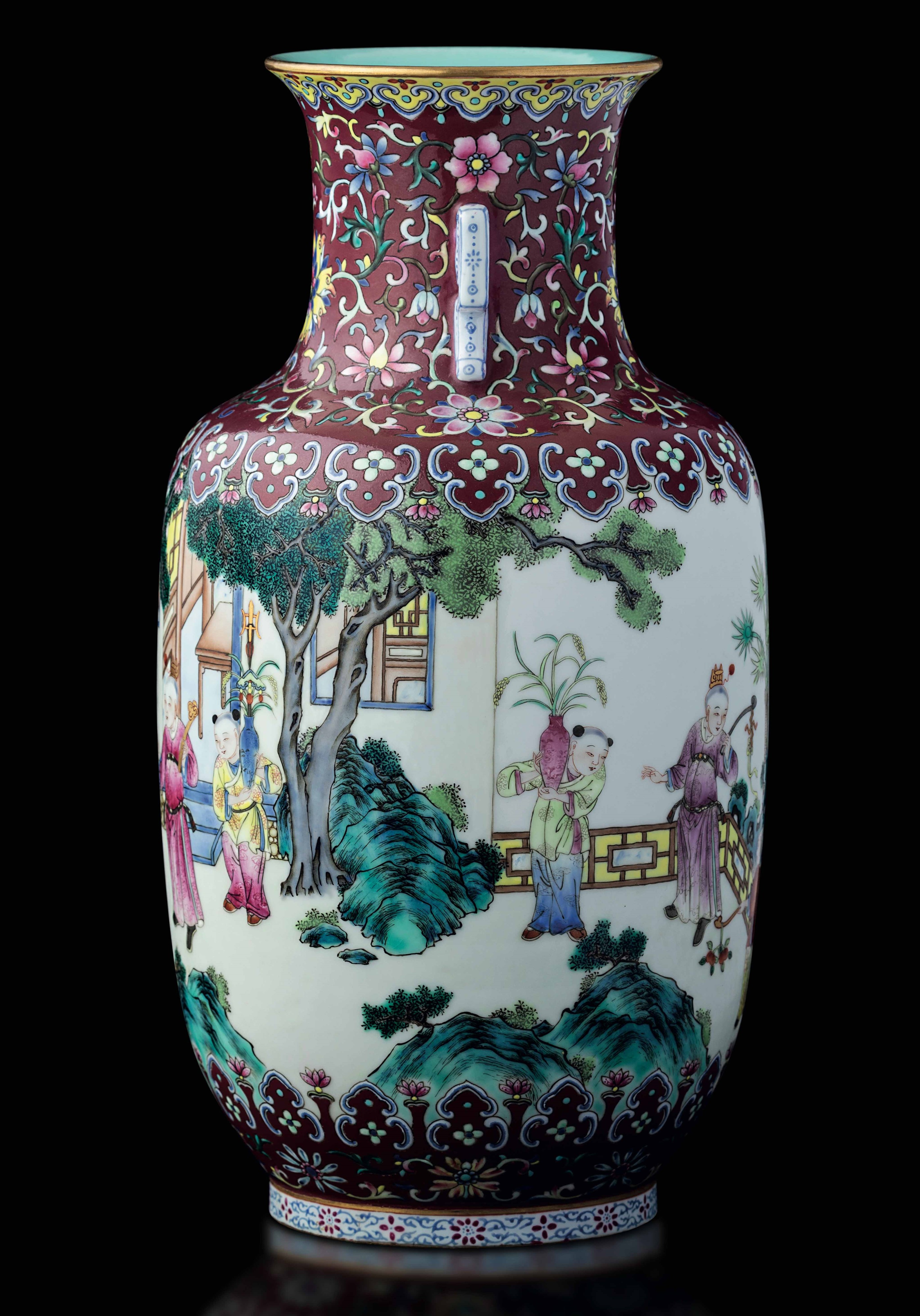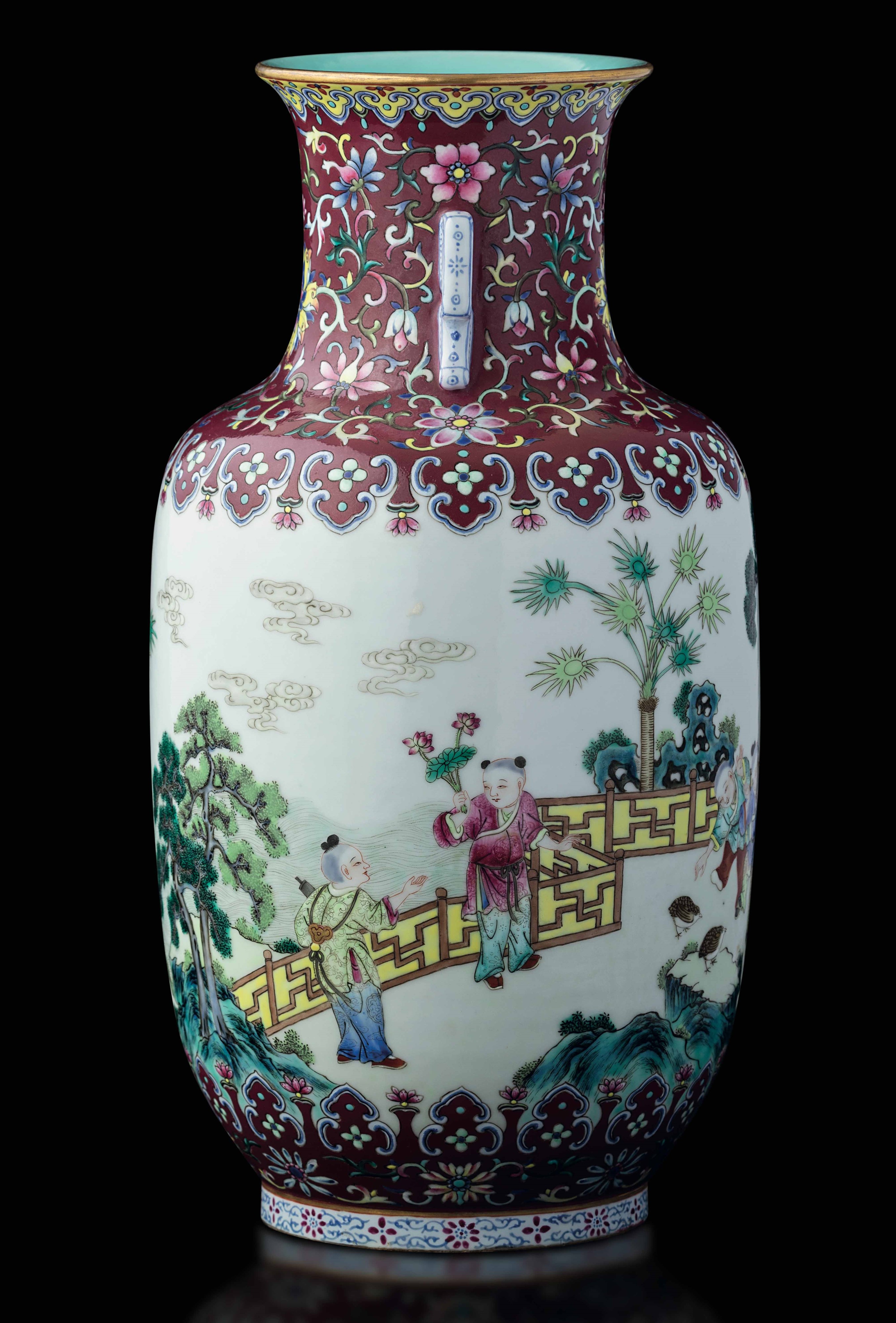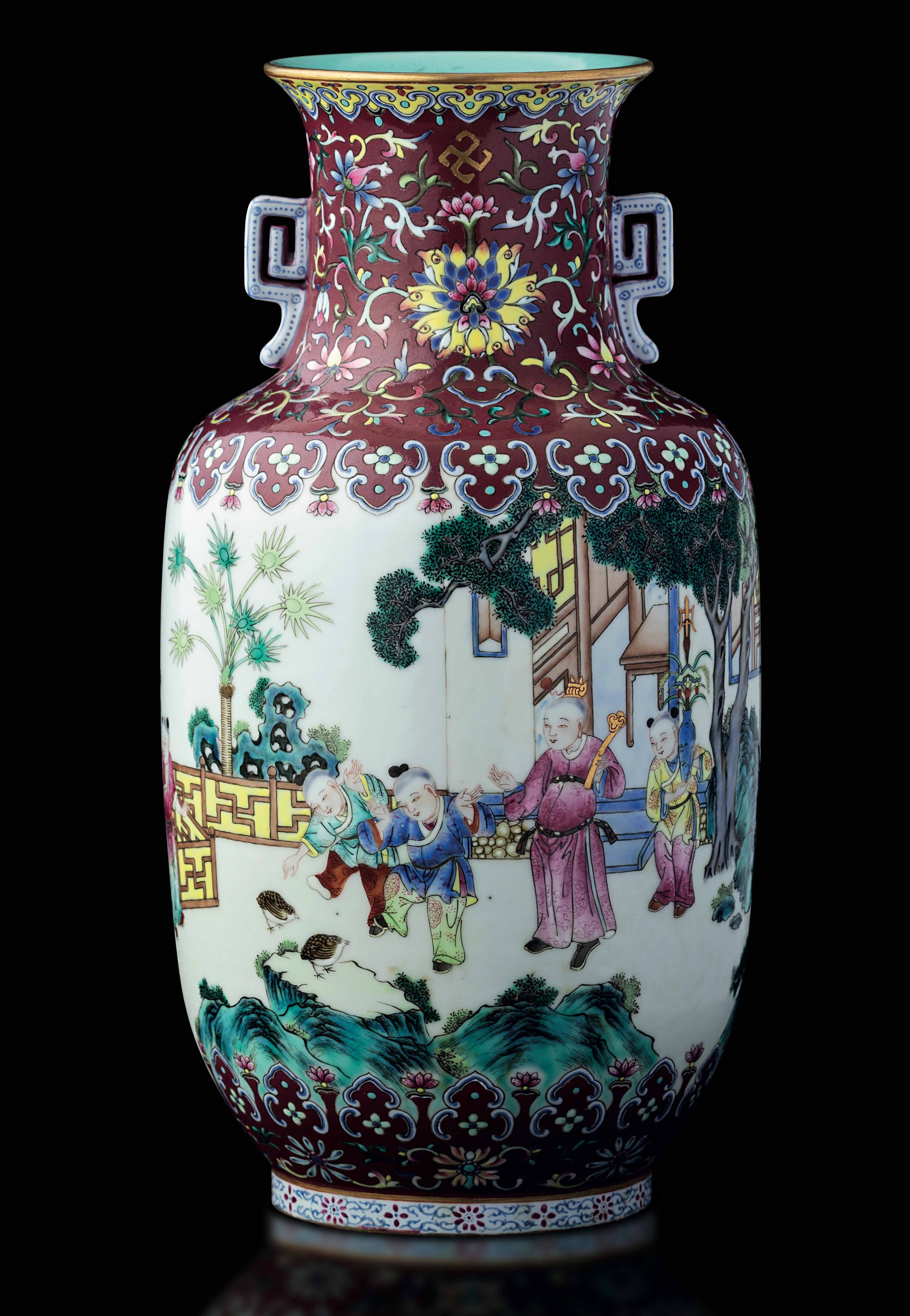 Vaso in porcellana con piccole anse sagomate e scena di vita comune con saggi e [..]