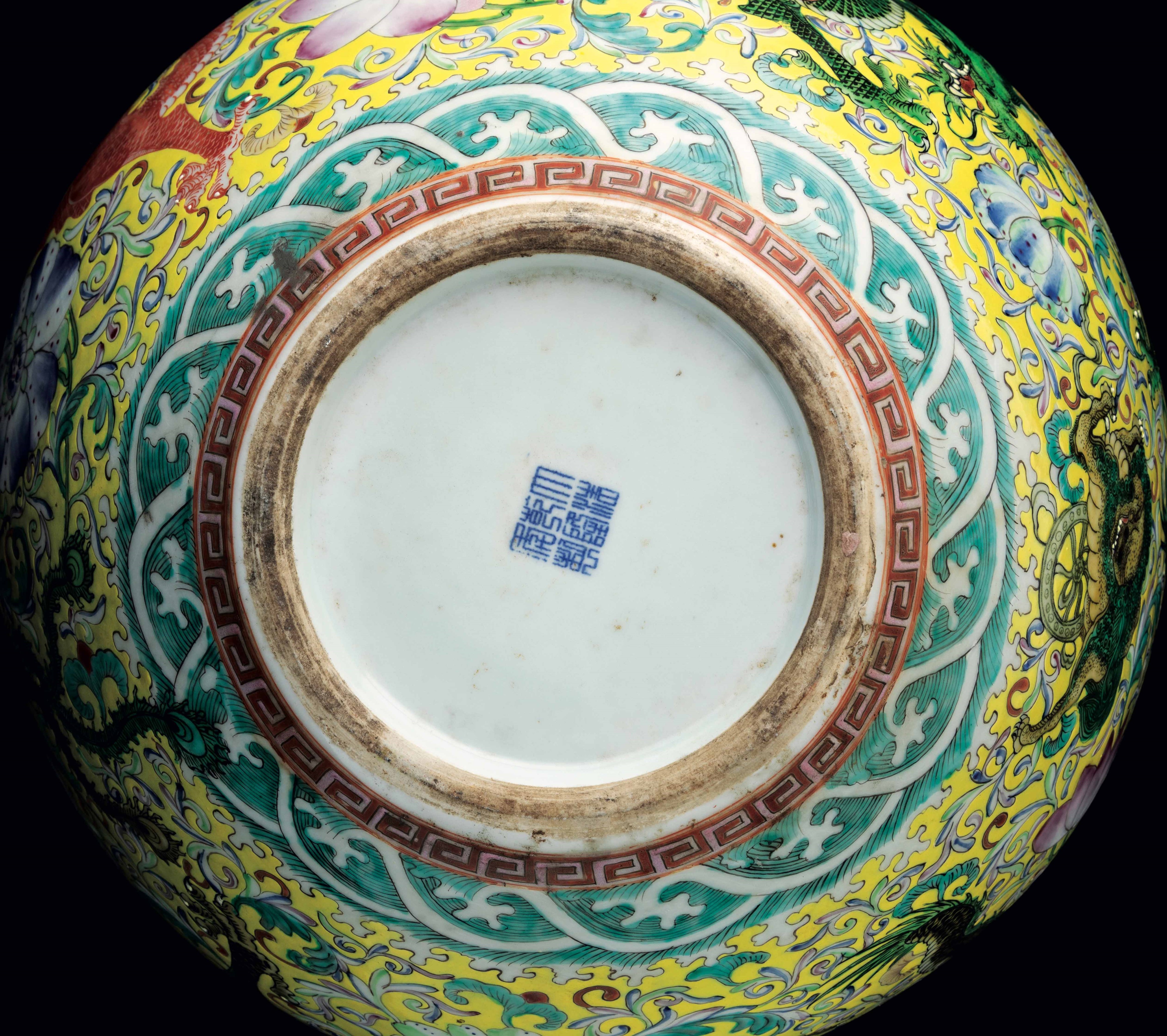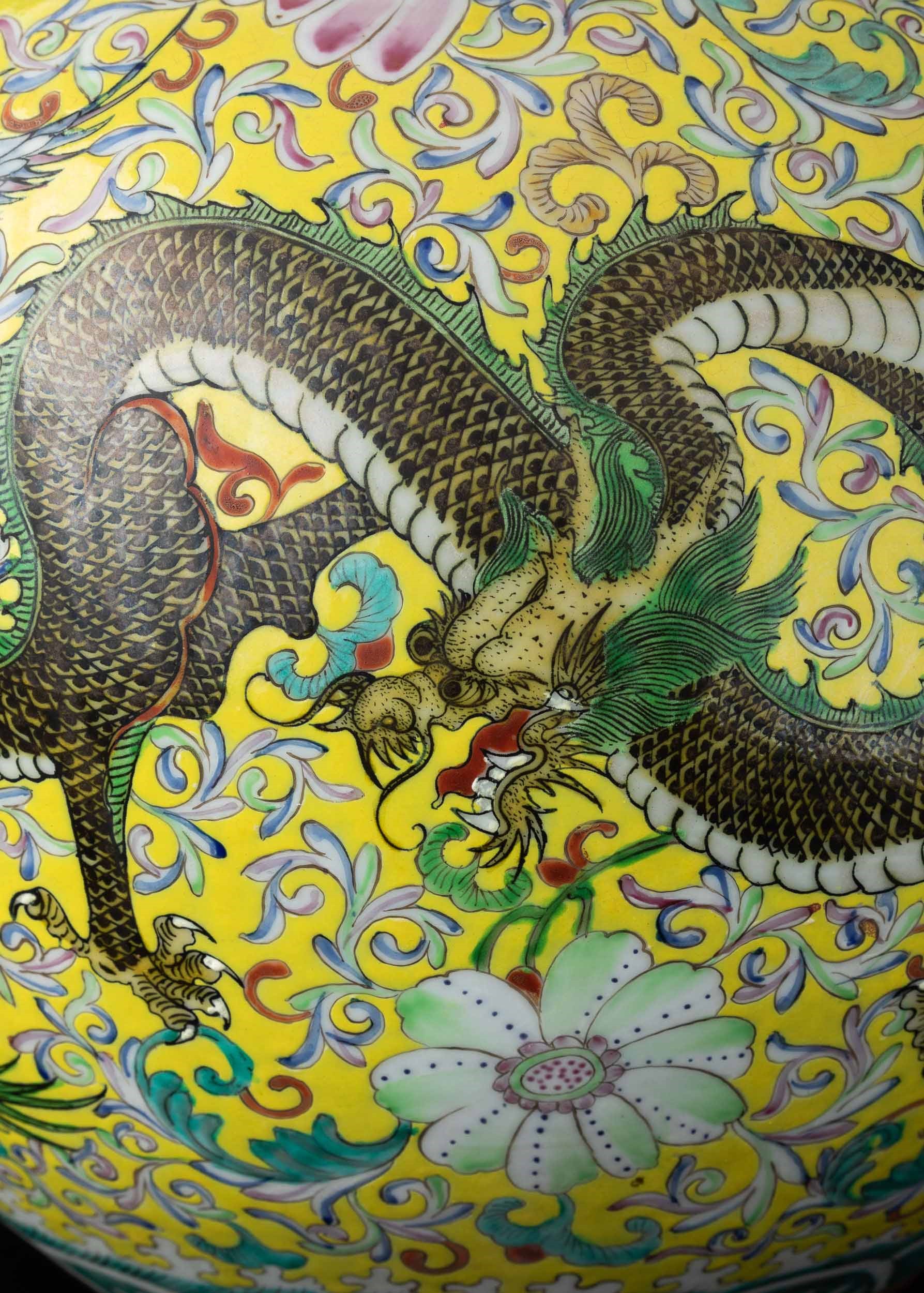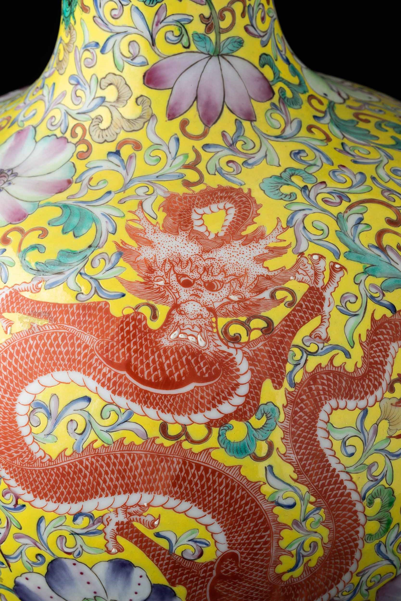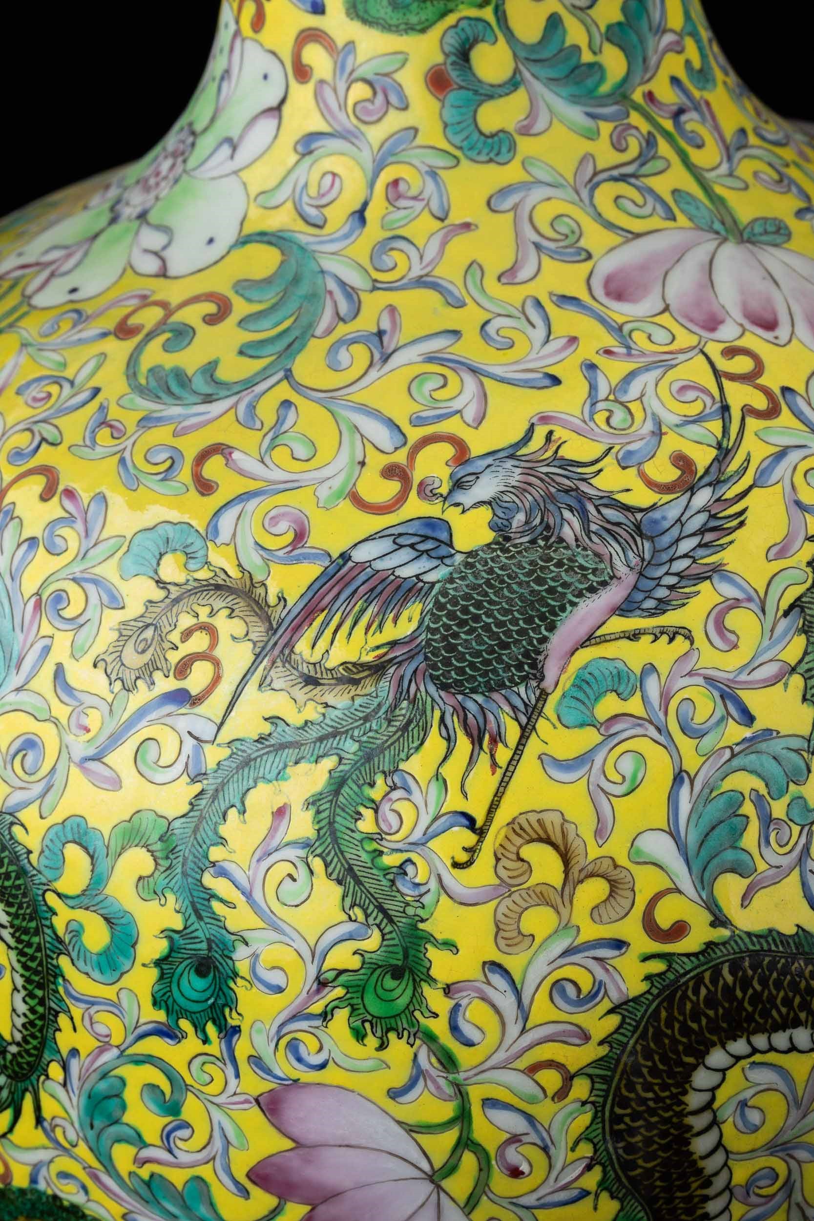 Vaso Tianqiuping in porcellana con decori floreali e figure di draghi su fondo giallo, [..]