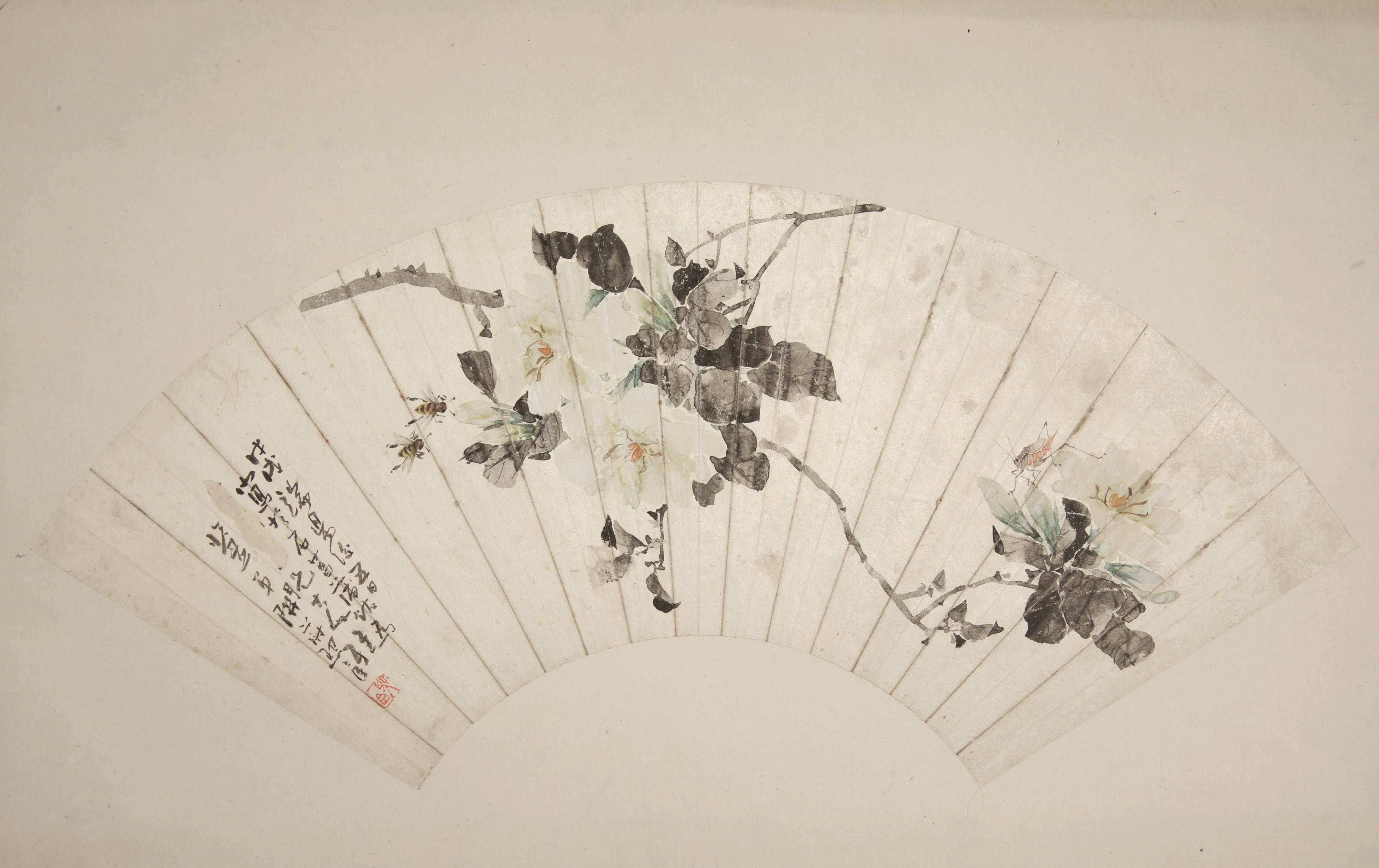 Ventaglio dipinto su carta raffigurante soggetto naturalistico con iscrizioni, Cina, [..]