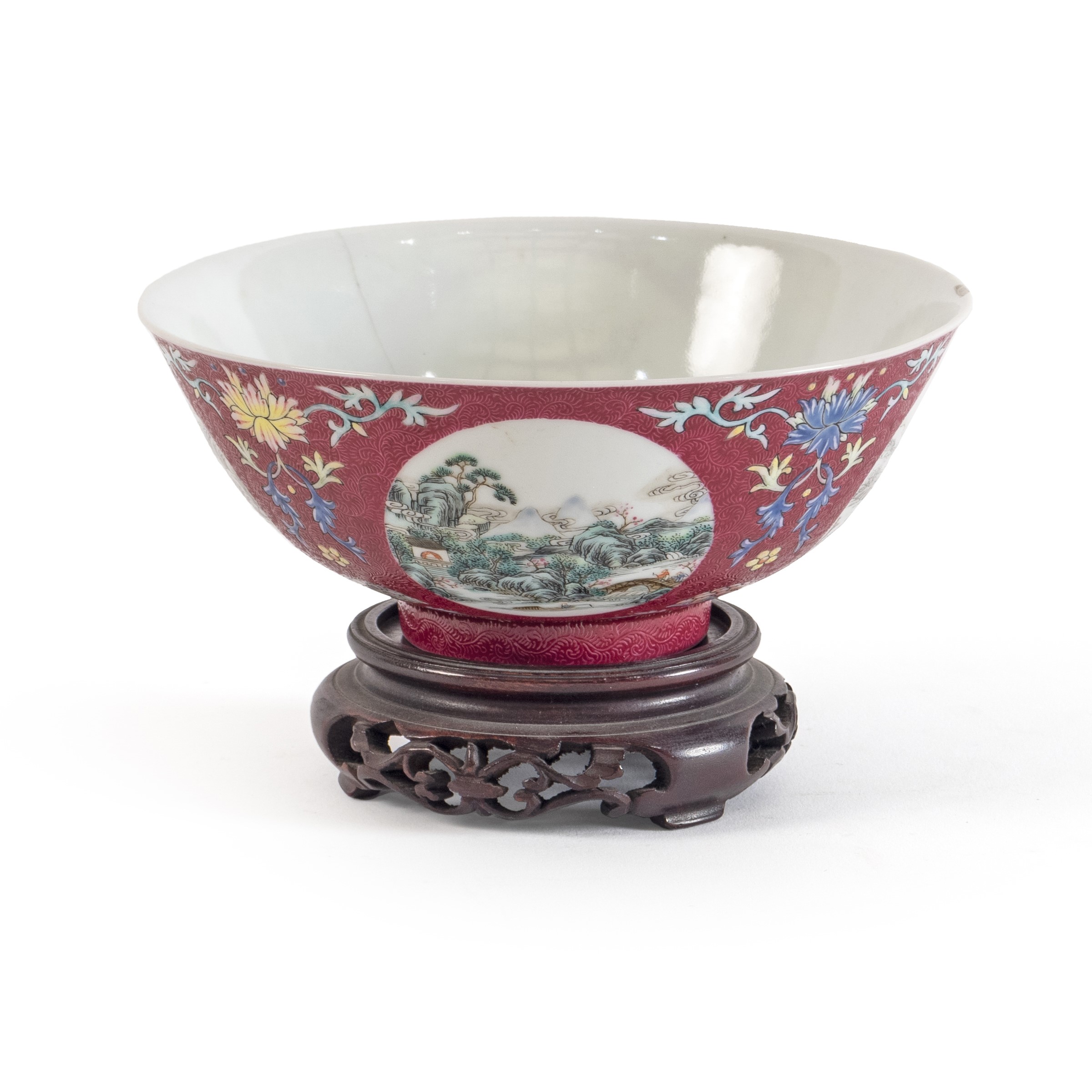Cina fondo rubino sgraffiato e decorato con quattro medaglioni Famiglia Rosa, marchio a sigillo del periodo Daoguang (1821-1850), lievi difetti