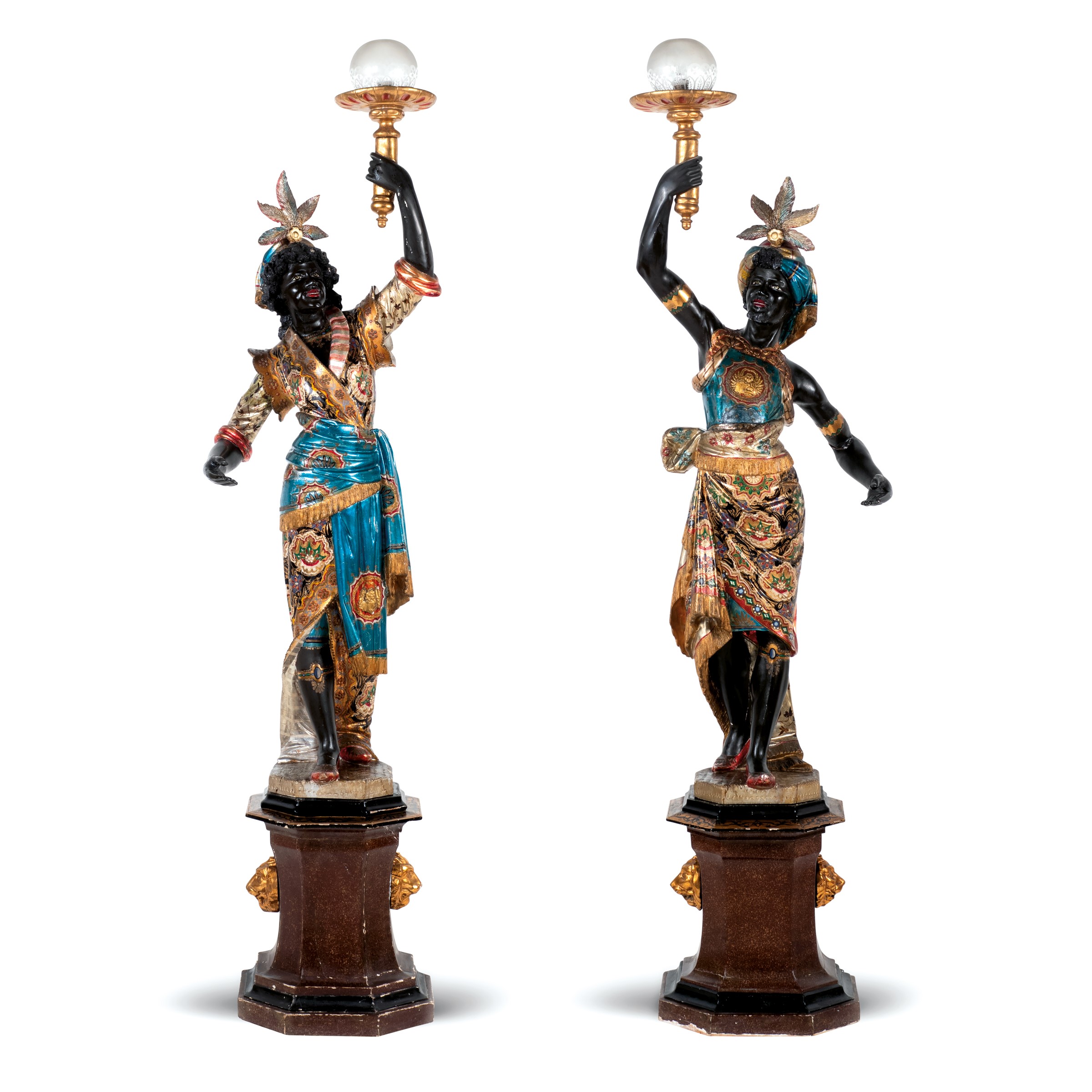 Venezia, XVIII Sec. raffiguranti mori portacero con turbante, decorati in policromia con ricchi motivi floreali e vegetali, poggianti su basi ottagonali a simulare il porfido, difetti e restauri