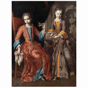 156x121 cm. Finale Marina 1686-Genova 1746 Ritratto di due bambine con cane, olio su tela, entro cornice in legno [..]