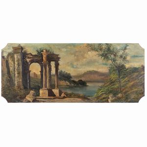 48x115 cm. fine XVIII-XIX Sec. Paesaggio con rovine, olio su tavola, entro cornice
