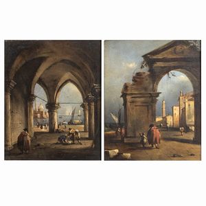 19x15 cm. Venezia 1712 - 1793 Scorci di Venezia, coppia di oli su tavola, entro cornici