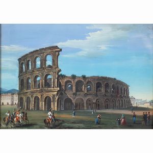 17x25 cm. fine XVIII-XIX Sec. Veduta del Colosseo con figure, tempera su carta, entro cornice