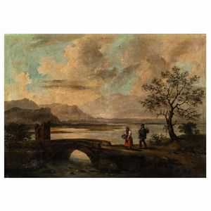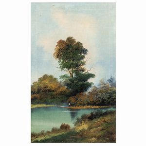 54x35 cm. XIX Sec. Paesaggio lacustre con pescatore, olio su cartoncino telato, firmato in basso a destra, entro [..]