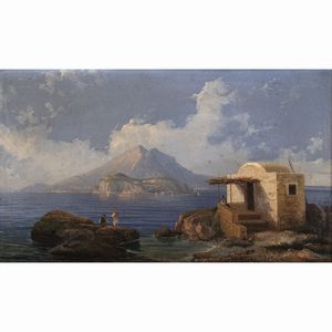 34x56 cm. XX Sec. Veduta del golfo di Napoli, olio su tela, entro cornice