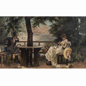 49x68 cm. attivo nel XIX Sec. Gita in barca, olio tela, firmato e datato 1878 in basso a sinistra