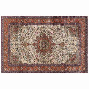 315x200 cm. XX Sec. disegno floreale policromo su fondo beige e arancio, difetti