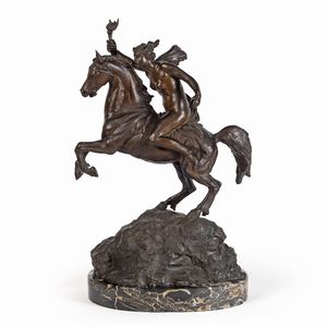 62x36x28 cm. Napoli 1857 - 1938 scultura in bronzo brunito raffigurante la Libertà, poggiante su base in marmo, [..]