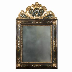 162x90 cm. Venezia, XVIII Sec. struttura di linea mossa, decorata con elementi vegetali e di volute, cimasa a [..]