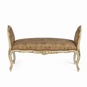 70x117x40 cm. Italia, XIX-XX Sec. seduta imbottita e rivestita in tessuto, gambe a riccio, lievi difetti