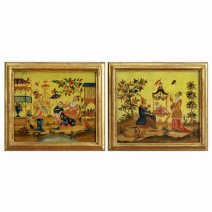 20x24 cm. Piemonte, XVIII Sec. raffigurante motivi a chinoiseries, entro cornici in legno dorato
