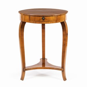 80x60 cm. Italia, XIX Sec. piano circolare con un tiretto sottostante, poggiante su tre sostegni di linea mossa, [..]