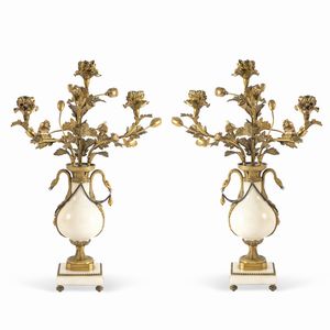 Coppia di candelabri in bronzo dorato e marmo bianco