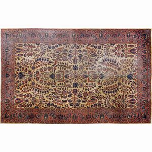 285x190 cm. XIX-XX Sec. disegno floreale su fondo beige e rosso, difetti e usure