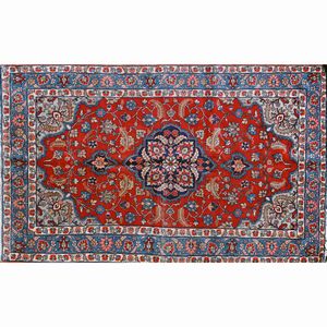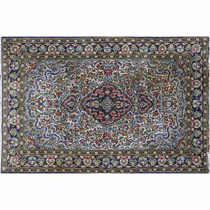 280x175 cm. Persia, XX Sec. disegno floreale policromo su fondo blu e azzurro, difetti