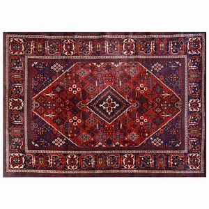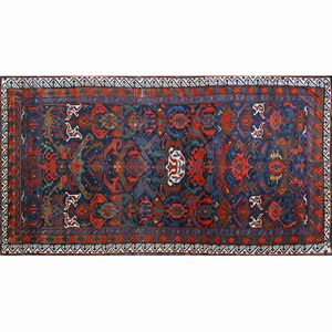 380x330 cm. XX Sec. disegno floreale e geometrico su fondo rosso e blu, lievi difetti