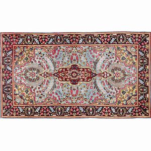 206x138 cm. XX Sec. disegno floreale, entro riquadri geometrici su fondo rosso e beige, lievi usure