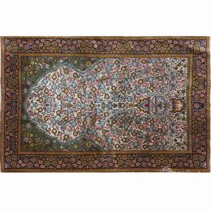 180x120 cm. XX Sec. disegno floreale policromo su fondo verde, lievi difetti