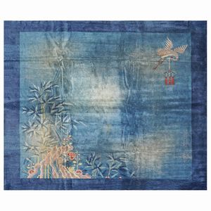 284x310 cm. XX Sec. disegno con vegetali e volatile su fondo azzurro e blu, usure e difetti