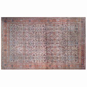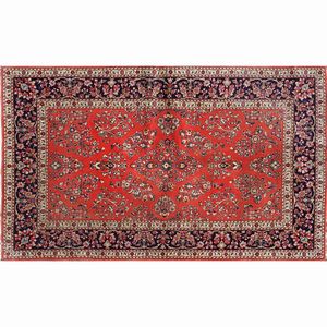297x233 cm. XX Sec. disegno floreale e geometrico su fondo rosso, lievi usure