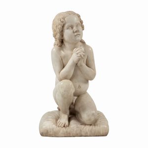 h. 70 cm. Firenze, XIX Sec. scultura in marmo bianco di Carrara raffigurante Bambino in preghiera, lievi difetti [..]