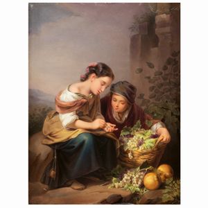 33x26 cm. manifattura europea, XIX Sec. forma rettangolare raffigurante Giovane venditore di frutta, soggetto [..]