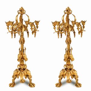 Coppia di candelabri a sei luci in bronzo dorato e cesellato