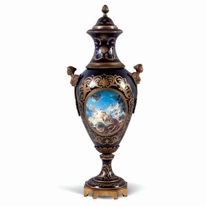 h. 74 cm. Francia, XX Sec. corpo centrato da due riserve ovali raffiguranti paesaggi con figure, montatura e [..]