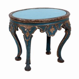 46x58x46 cm. Italia, XVIII Sec. in legno laccato nella tonalità dell'azzurro e dell'oro, piano ovale con vetro, [..]