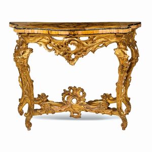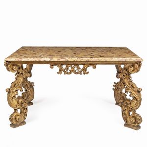 98x135x67 cm. Roma, XVIII Sec. corpo intagliato con ricche volute vegetali ed elementi floreali, piano sagomato [..]