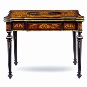 73x86x46 cm. Francia, XIX Sec. intarsiato in legni di frutto con motivi floreali e vegetali, gambe a fusto scanalato [..]