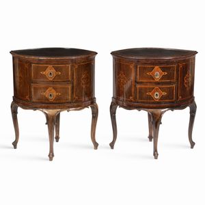70x59x34 cm. XIX-XX Sec. struttura a goccia, fronte a due cassetti, poggiante su quattro sostegni di linea mossa, [..]