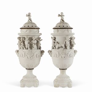 79x33x28 cm. XVIII-XIX Sec. decorate a raffigurare giochi di putti a tutto tondo, mascheroni, festoni e tralci [..]