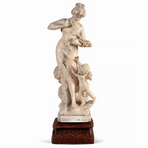 h. 70 cm. Italia, XIX Sec. raffigurante Allegoria della Primavera con putto, base in legno scolpito, difetti [..]