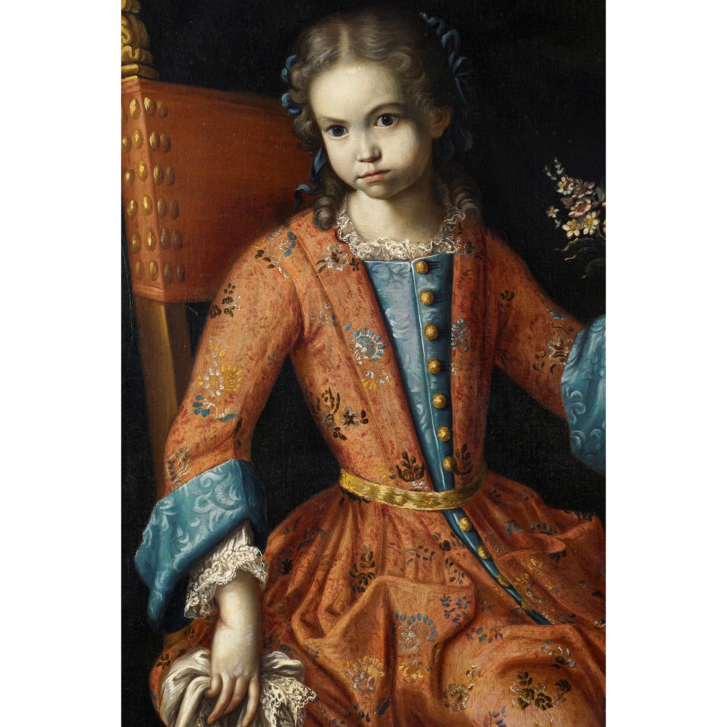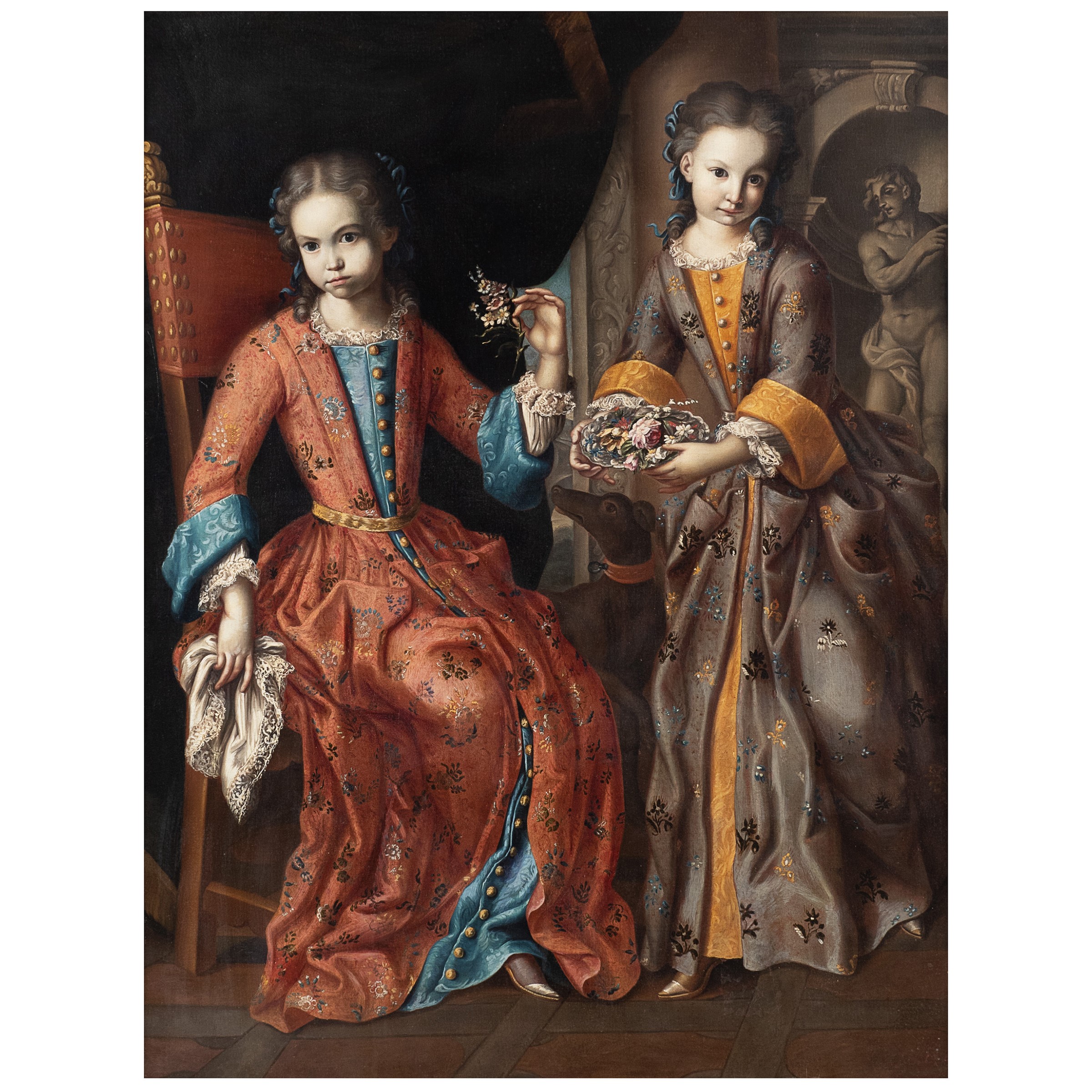 156x121 cm. Finale Marina 1686-Genova 1746 Ritratto di due bambine con cane, olio su tela, entro cornice in legno dorato Provenienza: Christie's, Londra 29 Giugno 1962, lotto 159, opera attribuita a Stefano Maria Legnani- Christie's, Londra 19 Aprile 1991, lotto 115, opera attribuita a Domenico Bocciardo