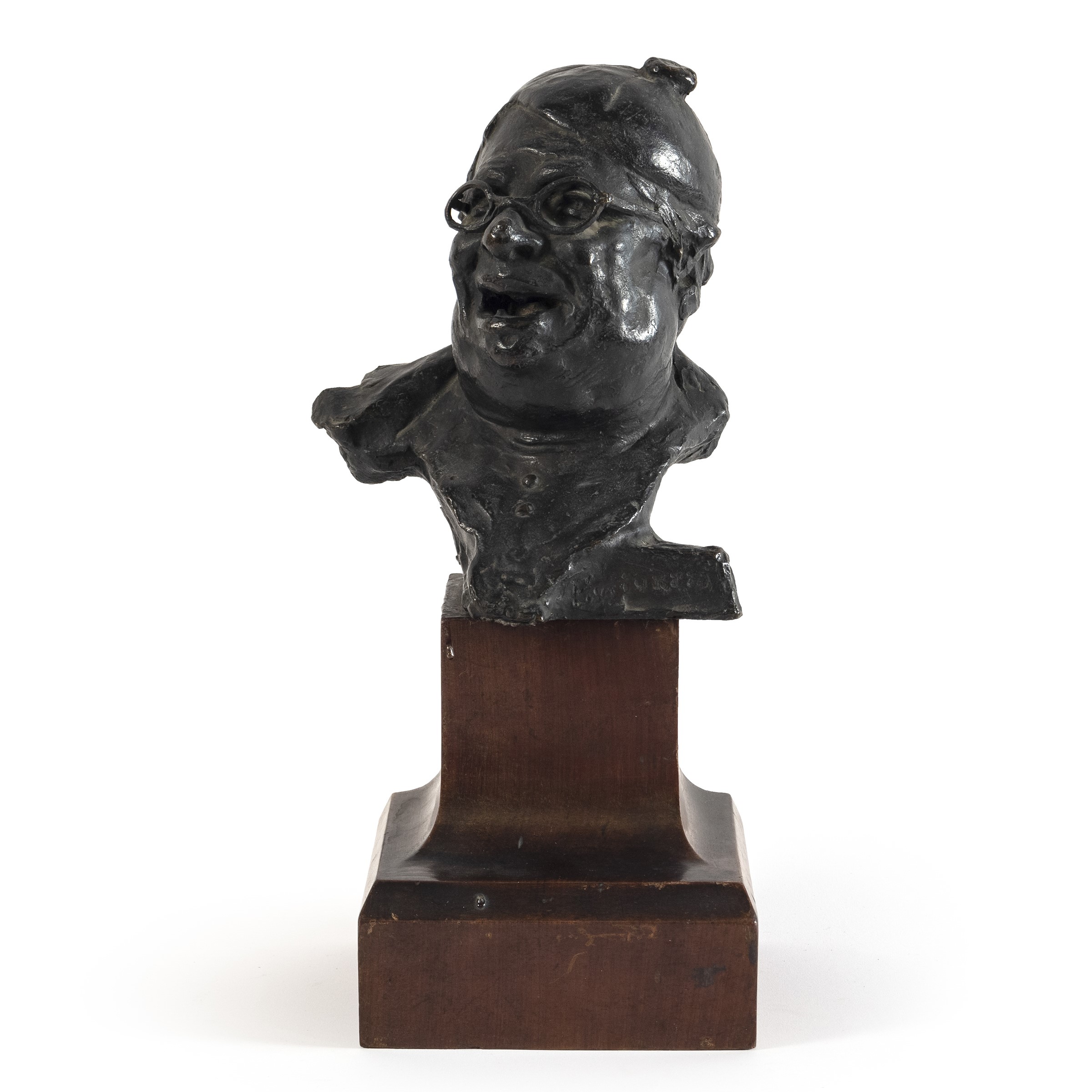 XIX-XX Sec. scultura in bronzo patinato raffigurante la testa di un curato, poggiante su base in legno