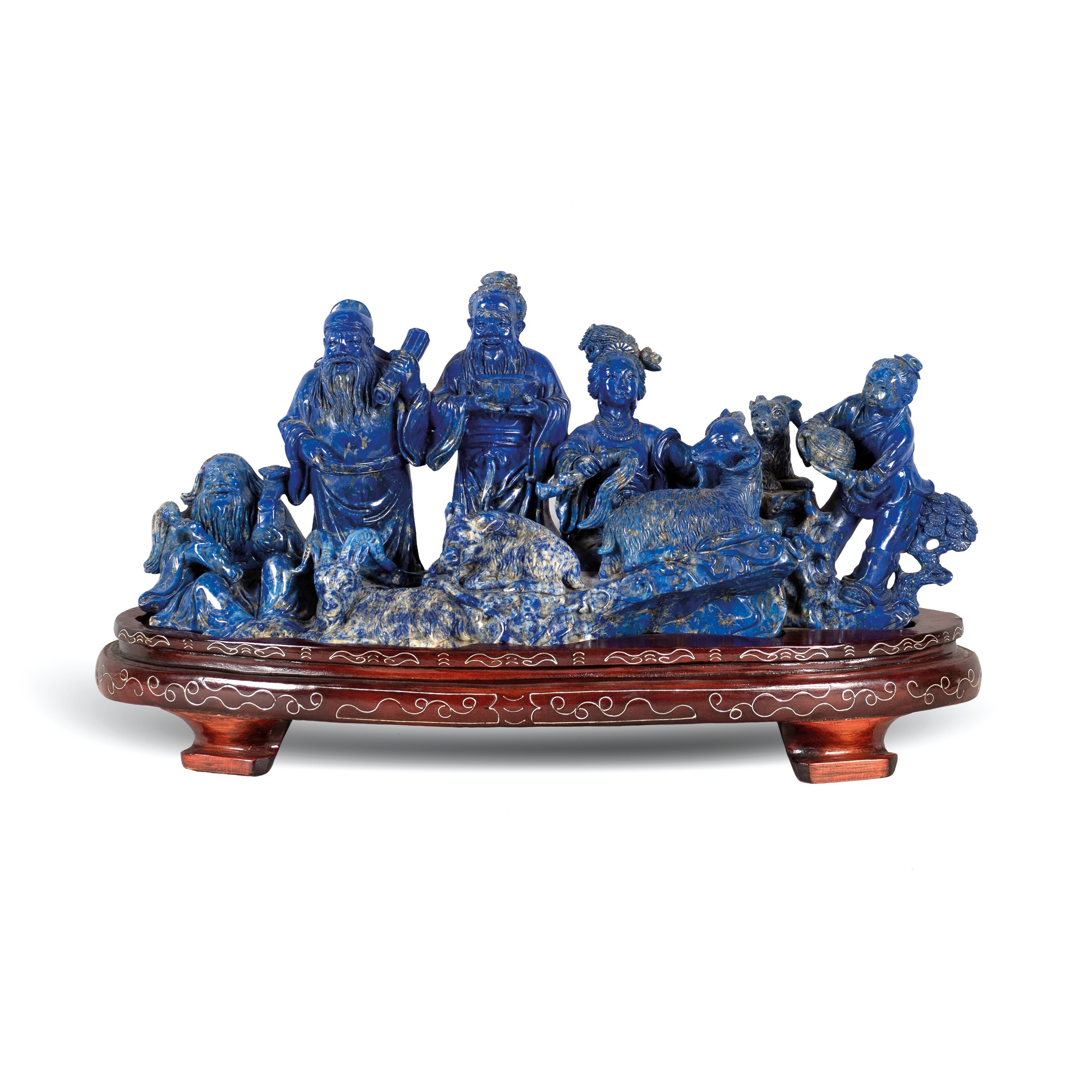 Cina, XX Sec. scolpito a raffigurare saggi con arieti, poggiante su base sagomata in legno
