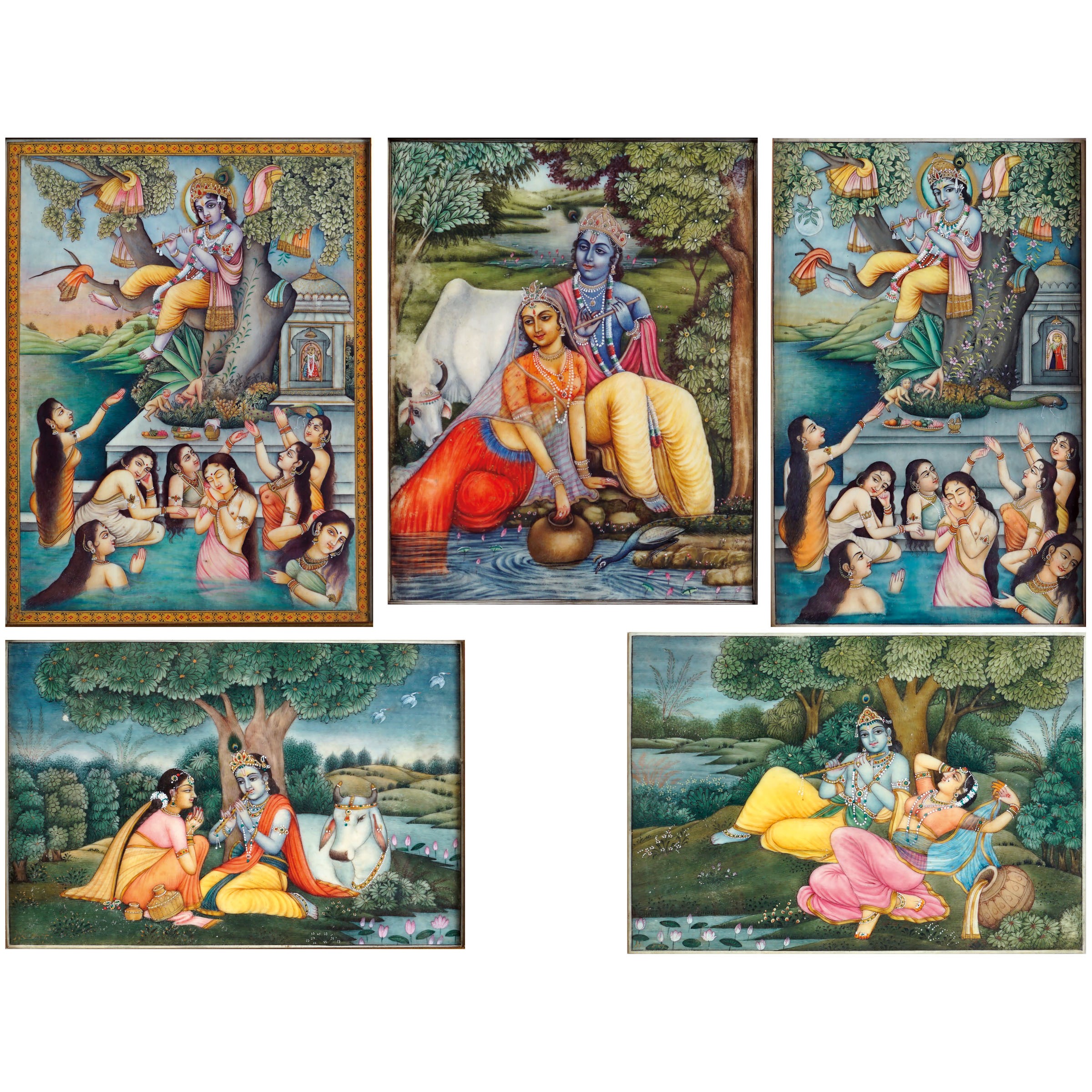 India XIX Sec. dipinte a mano, raffiguranti Scene della vita di Shiva, entro cornice in legno dorato e intagliato, misure diverse