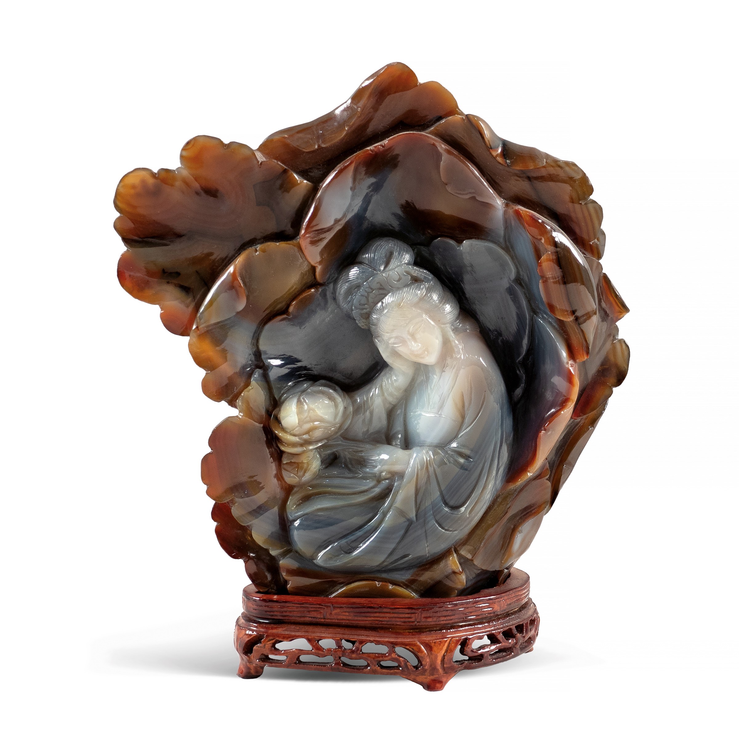 Cina, XX Sec. intagliato e modellato a foggia di foglie di loto con figura di Guanyin, poggiante su base in legno