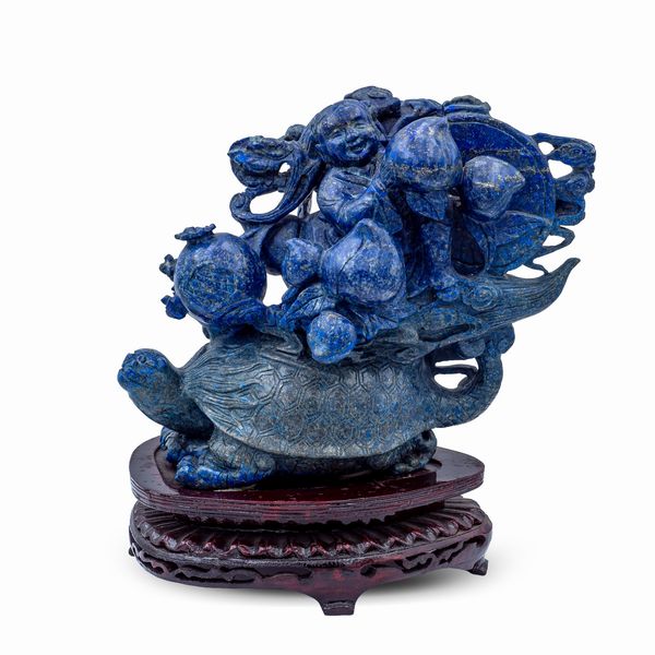 Cina, XX raffigurante un personaggio tra motivi vegetali e melograni, poggiante su una tartaruga, base sagomata in legno